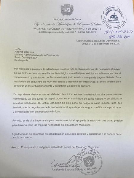 Hace unos días, me reuní en el Palacio Nacional y aproveché la ocasión para hacer una solicitud formal relacionada con el proyecto de remozamiento del nuevo Matadero Municipal.